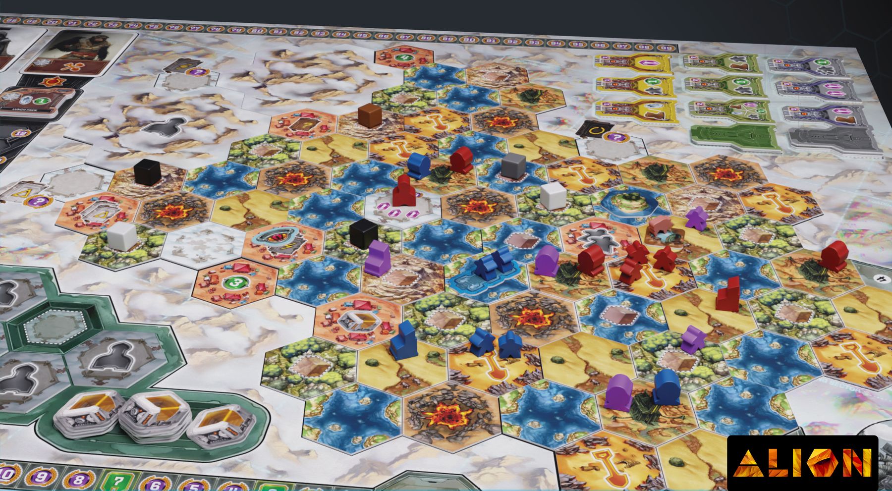Un pequeño vistazo: En cuanto a las mecánicas del juego, tenemos una selección de acciones en nuestro tablero de jugador que nos permite mover a los miembros de nuestra tribu (los meeples) por el mapa, revelar regiones del mapa inexploradas o construir o excavar en diferentes localizaciones del mapa.