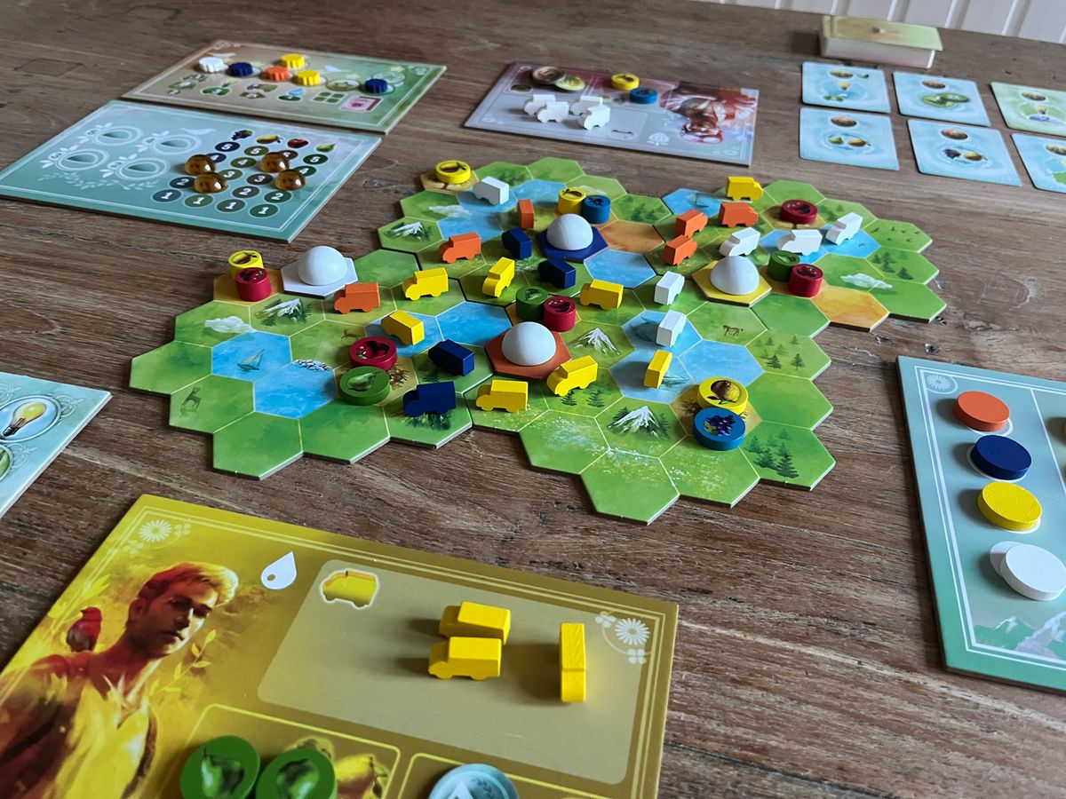 ¿Por qué entra este juego a mi top? Este es un juego que encontré por casualidad excavando la lista de novedades de 2025 en BGG, no sé de dónde a salido ni si está disponible. Es un juego que me ha entrado por los ojos. Por el mapa hexagonal y cómo se repiten algunos meeples de camiones por el mapa me hacía pensar que algo de construcción de rutas iba a tener, y en la descripción del juego mencionan que tiene cierta temática de agricultura.